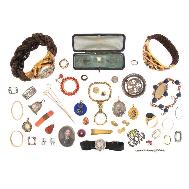 Various items of jewellery, including a 19th century plaited hair bracelet with gold clasp applied with gold initials, a 19th century plaited hair bracelet with pearl-set gold clasp centred with a pearl and diamond star and blue enamel decoration (damaged), a diamond-set cocktail watch, a stone-set gold signet ring, six assorted pendants, a Regency gold quizzing glass frame, and various other items of jewellery