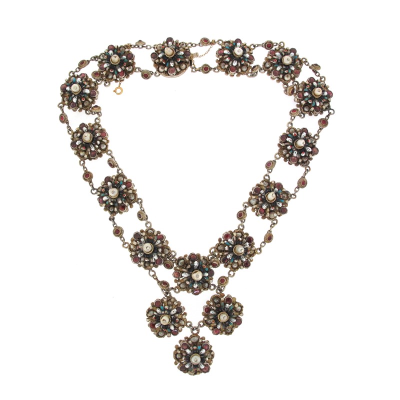 A Renaissance Revival necklace, formed as gilt metal clusters mounted with garnets and pearls with enamel decoration to both sides, 45cm, fitted case