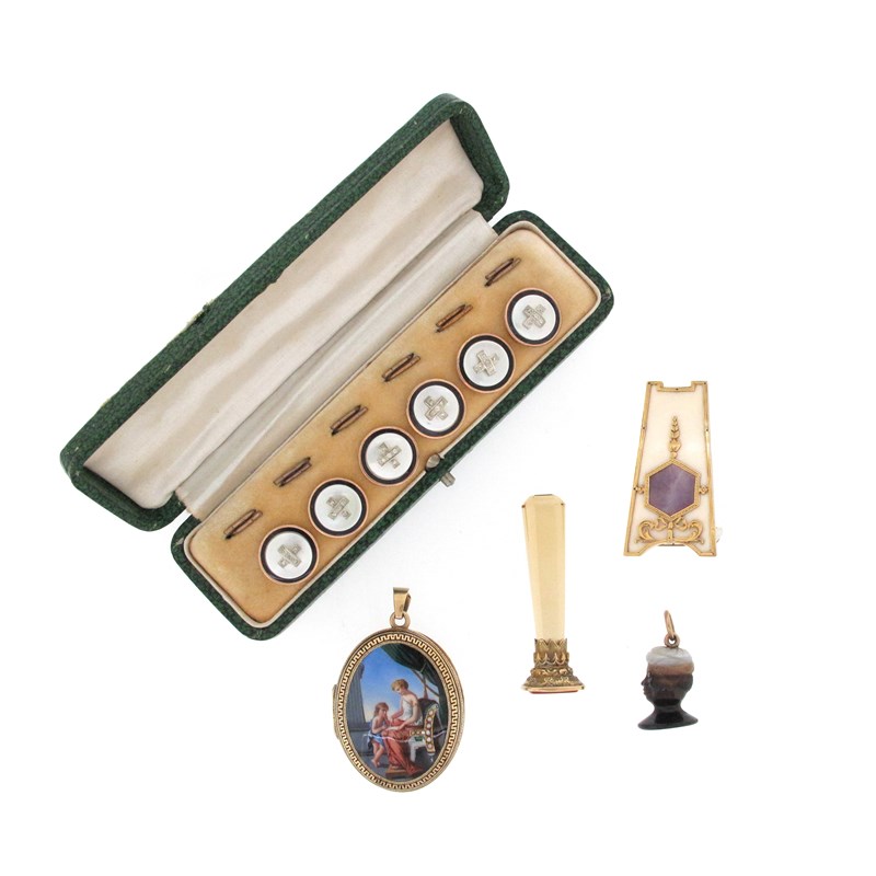A quantity of jewellery items, including an early 19th century miniature desk seal, with faceted and tapered citrine handle, the carnelian matrix engraved with the initials EA beneath a Baron's coronet and with fine decoration to the joint, 4.6cm high, a French Empire-style miniature ivory and gold picture frame, the tapered ivory mount with hexagonal gold frame to the glazed compartment over a scrolling bow design, further gold work to the foot and with amethyst back to the reverse access port, French control marks, a carved agate blackamoor pendant, with diamond-set eyes and gold suspension ring, 2cm high, an oval-shaped gold locket pendant, the hinged cover painted in enamel with a seated woman on a pearl-set chair with a child reading at her knees, glazed locket compartment to the reverse, 4cm high, and a case six shell and gold dress studs, the circular shell sections within black enamel borders and diamond-set cross to the simulated button holes