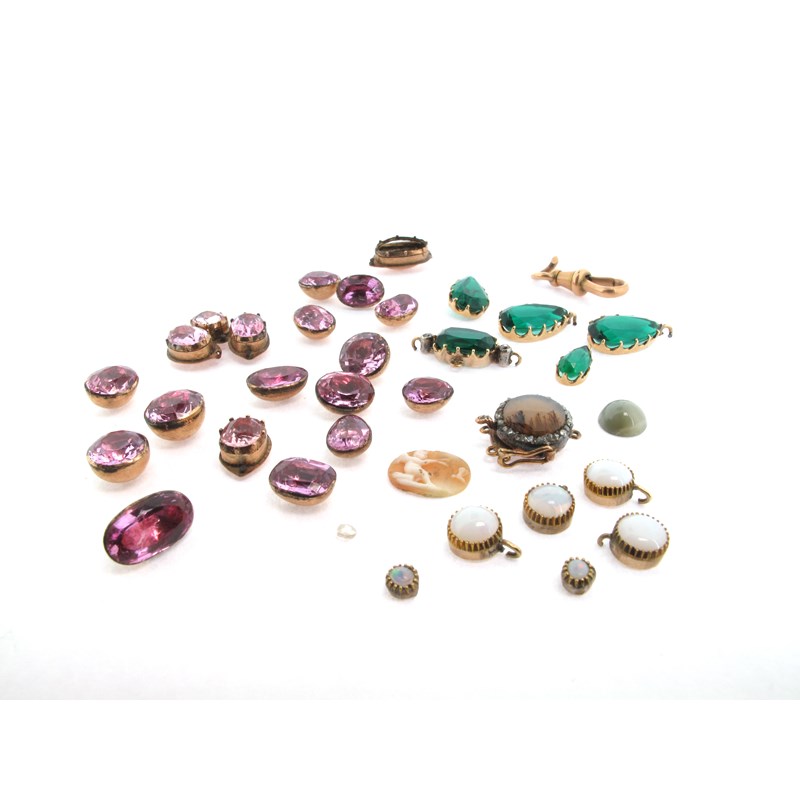 An assorted collection of cut-down stone-set collets, including a moss agate on guilloche ground-mounted gold clasp, within a rose-cut diamond surround and spiral fluting engraved decoration, the others mounted with pink topaz, opals, green stones, a cat's-eye and a small carved shell cameo depicting a seated Cupid playing pan pipes with a butterfly, 1cm wide