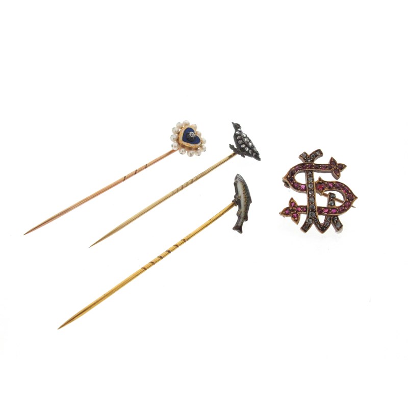 A collection of stick pins and a gem-set brooch, one gold stick pin mounted with a silver and gold partridge pave-set with diamonds and with ruby eye, cased, a gold stick pin mounted with a silver salmon with realistic enamel decoration, a gold stick pin mounted with a blue and white enamel heart centred with a diamond within a seed pearl border, cased and a ruby and diamond-set brooch with initials LS
