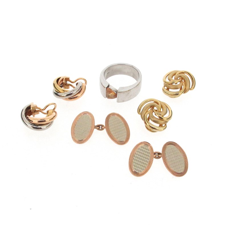 A small quantity of jewellery, including a pair of 9ct two-colour gold cufflinks with engine-turned decoration, a pair of gold swirl earrings, a pair of three-colour gold half-hoop earrings and a white gold ring set with a triangular-shaped topaz, size T
