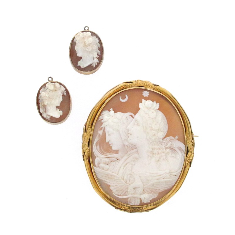 A carved shell cameo brooch depicting Nyx and Hemera (Night and Day) within yellow gold border, 6cm high, together with two smaller carved shell cameos