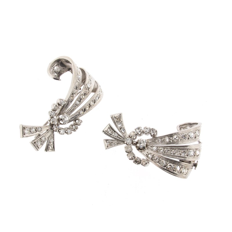 A pair of matching diamond-set scroll brooches, each scrolling spray brooch set with an old-cut circular-shaped diamond and further graduated single-cut diamonds in white gold, 3.5cm wide