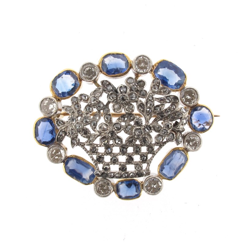 A diamond and sapphire-set gold and platinum giardinetto brooch, the basket of flowers millegrain-set with rose-cut diamonds within a border alternately-mounted with oval-shaped sapphires and circular diamonds, 3.5cm