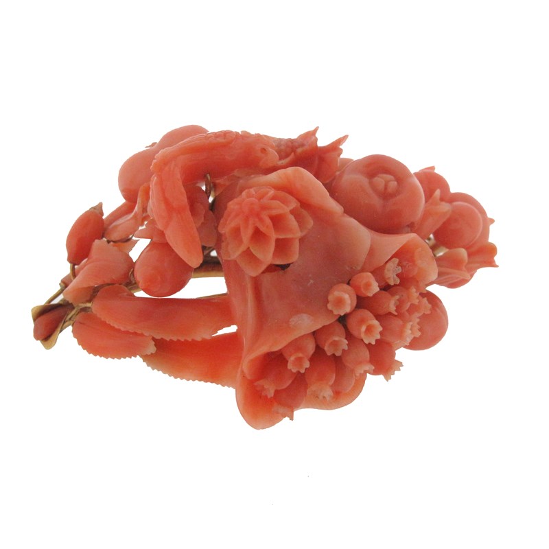 A 19th century carved coral brooch, of foliate form and with a parrot, gold mounts, 6.5cm high