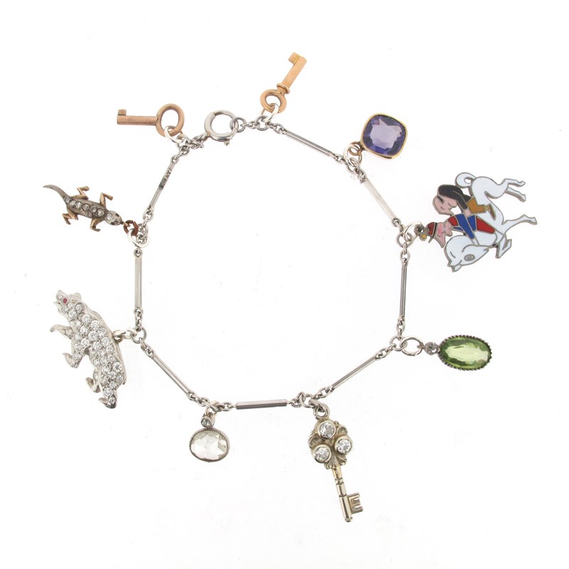 An unusual charm bracelet, the bar-link platinum bracelet mounted with a Van Cleef & Arpels cartoon charm with enamel decoration depicting two characters riding a horse, a platinum bear pave-set with diamonds and with a ruby eye, a lizard set with rose-cut diamonds, an oval-shaped rose-cut diamond pendant, a diamond-set key and two coloured-stone-mounted pendants and two gold keys, 16cm long
