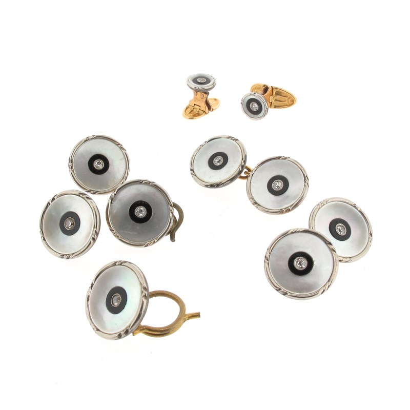 A pair of early 20th century dress cufflinks and studs, comprising two larger cufflinks, two smaller cufflinks and four dress studs of circular form and set with a circular-cut diamond within a surround of onyx and mother-of-pearl in yellow and white gold, 1.4 & 0.8cm high