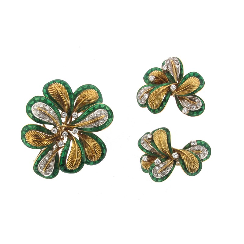 A gold floral brooch with matching earrings, all designed as abstract flower heads in yellow and white gold, set with diamonds and with green enamel border decoration, 39g total