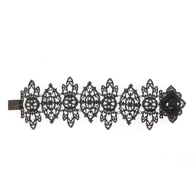 An early 19th century Berlin ironwork bracelet, of revivalist influence and alternating with pierced panels of different styles, 20cm