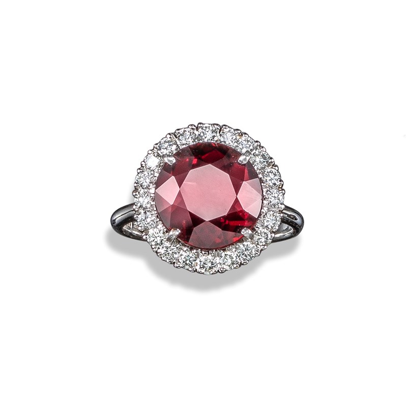 A garnet and diamond cluster ring, the circular-cut garnet set within a surround of round brilliant-cut diamonds in white gold, with maker's mark and London hallmarks for 2017, size M