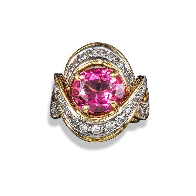 A 18ct white gold, pink tourmaline and diamond cluster ring, 1950s, the oval-shaped rubelite is claw-set within a surround of single-cut diamonds in an intertwined yellow mount, with further circular-cut diamonds set to the shoulders, size I 1/2