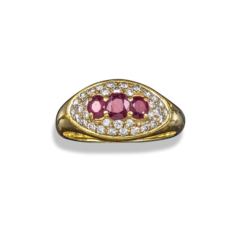 A ruby and diamond cluster ring, the three graduated oval-shaped rubies set within a surround of pavé-set round brilliant-cut diamonds in yellow gold, with obscured maker's mark and Italian hallmarks for 18ct, with London import marks for 1983, size O 1/2