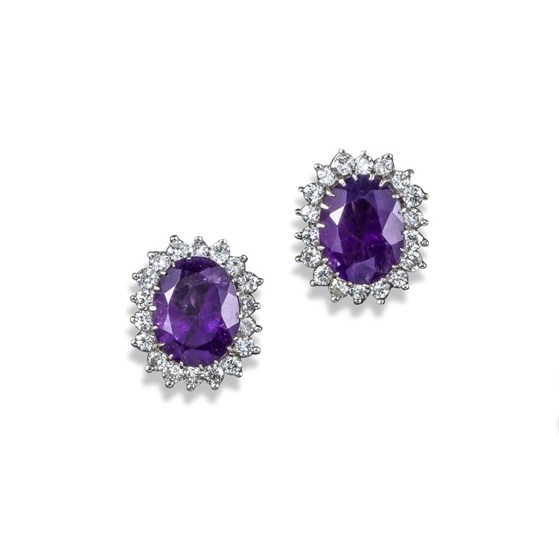 A pair of amethyst and diamond cluster earrings, the oval-shaped amethysts set within a surround of round brilliant-cut diamonds in white gold, post and clip fittings, 2cm high