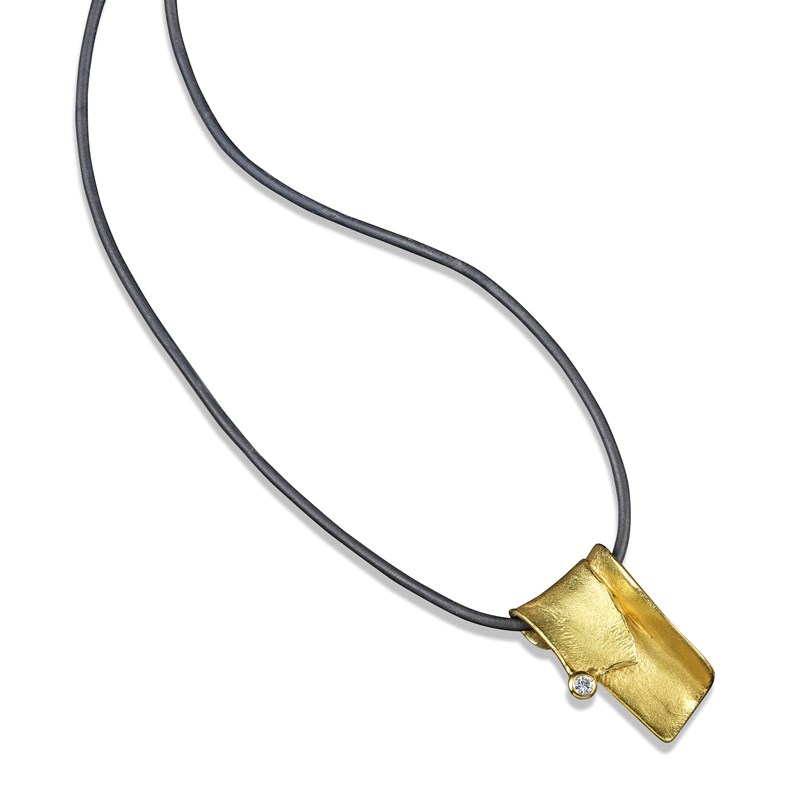 A diamond-set yellow gold pendant, the abstract plaque-form pendant is rubover-set with a round brilliant-cut diamond, 3.2cm high