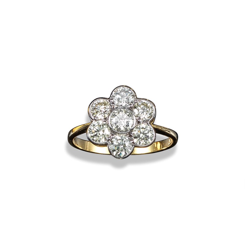 A diamond cluster ring, the seven round brilliant-cut diamonds weigh approximately 1.65cts total and are set in yellow and white gold, size O 1/2