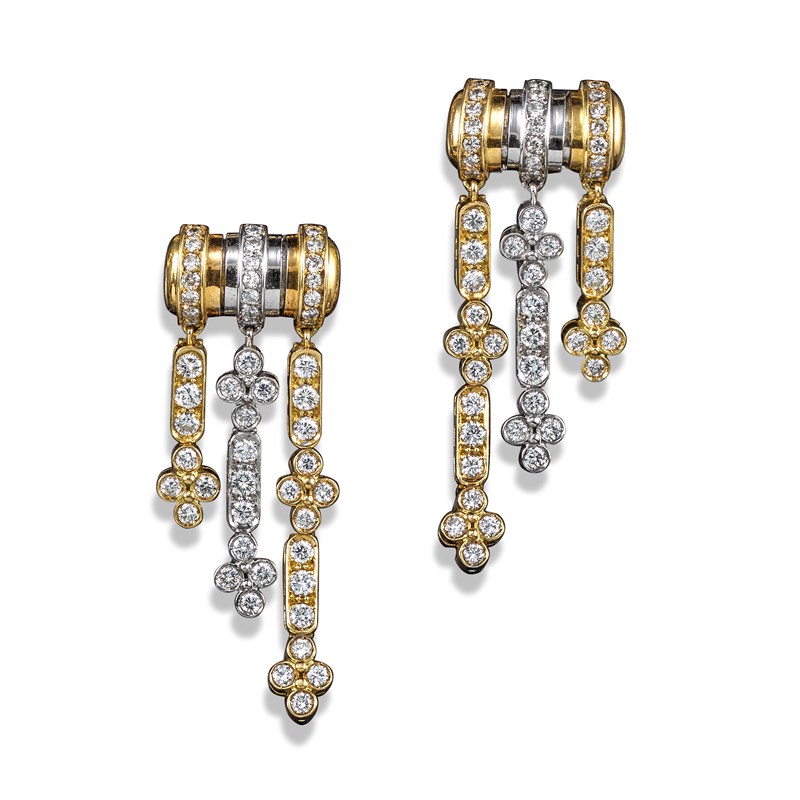A pair of French two-colour gold and diamond drop earrings, the upper sections set with rows of circular-cut diamonds and each suspending an articulated drop section, the quatrefoil and vertical links pave-set with round brilliant-cut diamonds, post fittings, with French control marks and maker's mark SB within lozenge, 4.5cm long