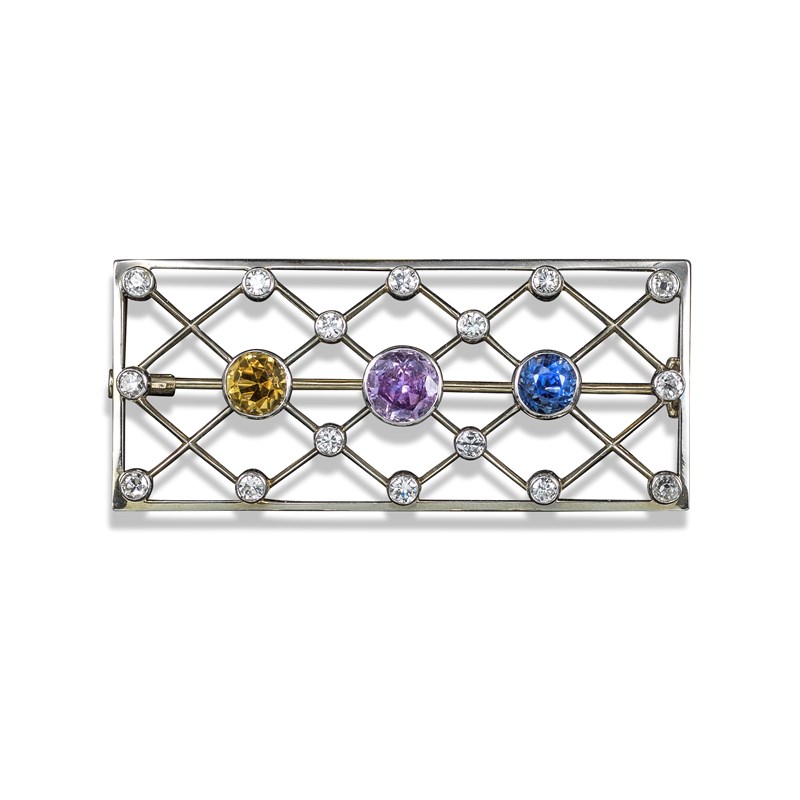 A French multi-gem-set gold brooch, set with three principal stones consisting of a blue sapphire, a pink sapphire and yellow paste, within chequerboard diamond setting in platinum and white gold, French control marks and rubbed maker's mark, 6cm wide