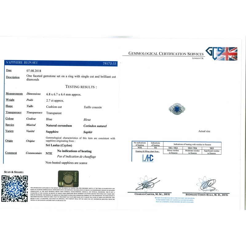 Accompanied by report number 78172-53 dated 7 August 2018 from GCS, London stating that the cushion-cut sapphire weighs approximately 2.70cts and is a natural sapphire with no indications of heat treatment. Origin: Sri Lanka