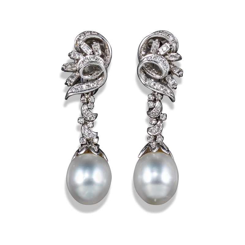 A pair of cultured pearl and diamond drop earrings, the scroll and spray-form upper sections set with single-cut diamonds in white gold, each suspending an articulated foliate line set with single-cut diamonds and a drop-shaped white cultured with diamond-set caps, clip fittings, 4.9cm high