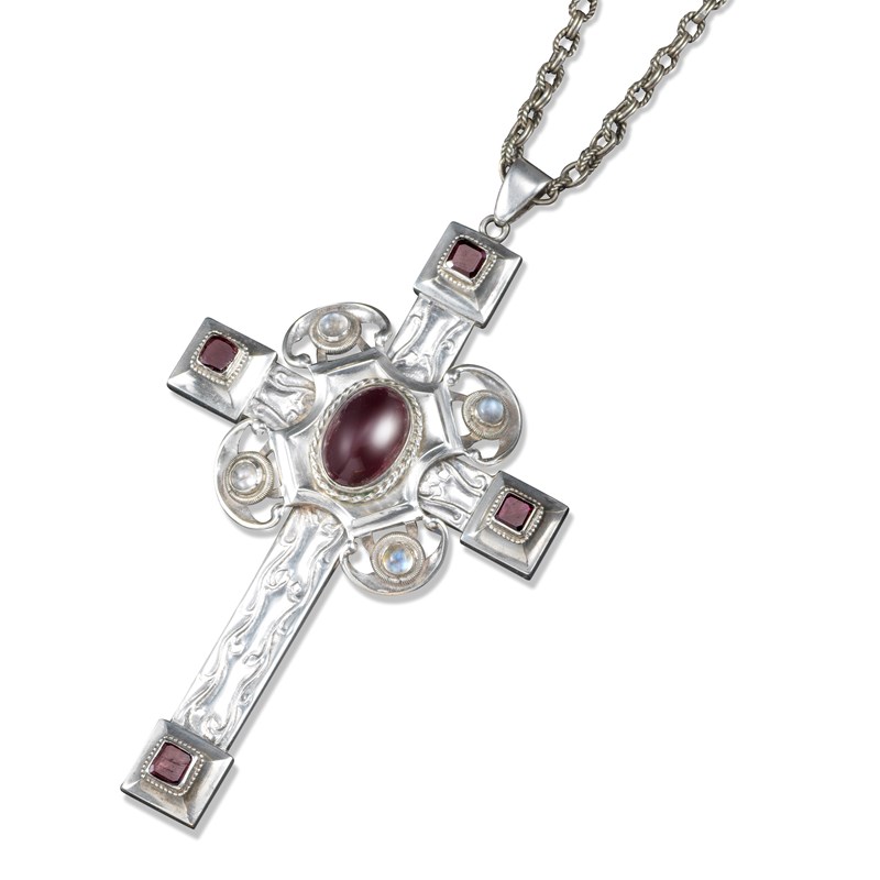 An Arts & Crafts stone-mounted silver Pectoral Cross, chased with foliate decoration and centred with an oval-shaped garnet cabochon and four moonstones to the raised centre section each terminal mounted with a square-shaped garnet to the raised square mount, engraved to the reverse A.D. IV NON. FEB, Georgio Halford D.D. Episcopo Secundo, Qui Cum EO Apud Rockhamptonenses Collaboraverunt Sacerdotes Hang Crucem Signo Amoris Donodederunt, maker's mark ETWW above A.D.MCMIX, 11cm high, on a fancy-link silver chain, 33cm, with damaged case marked for The Artificers' Guild Ltd, 9 Maddox Street, London