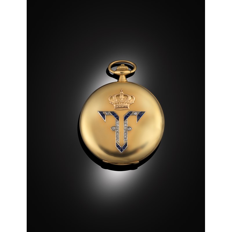 An 18ct gold hunter pocket watch by Longines, with lever escapement, the gold case with the crest and monogram of King Farouk, the initials set with calibré-cut sapphires and circular-cut diamonds in platinum, the signed circular dial with black Roman numerals, subsidiary seconds dial, the movement signed and numbered 2529803, 5cm wide, leather pouch