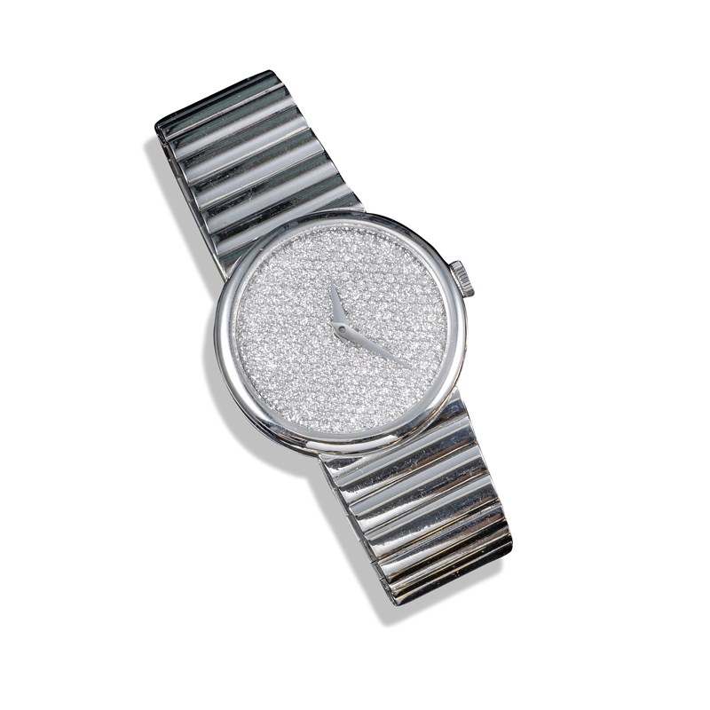 A diamond-set white gold wrist watch, the circular face pavé-set with small circular-cut diamonds with a white gold bezel and back, and graduated white gold bar-link bracelet, 18.5cm, 106g total