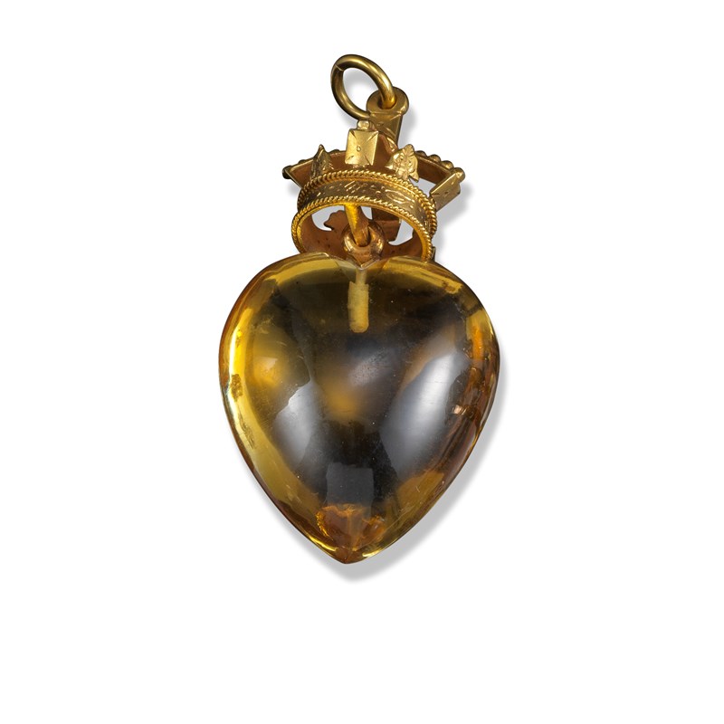 A 19th century heart-shaped citrine pendant, set beneath and yellow gold coronet, 5cm long, fitted case