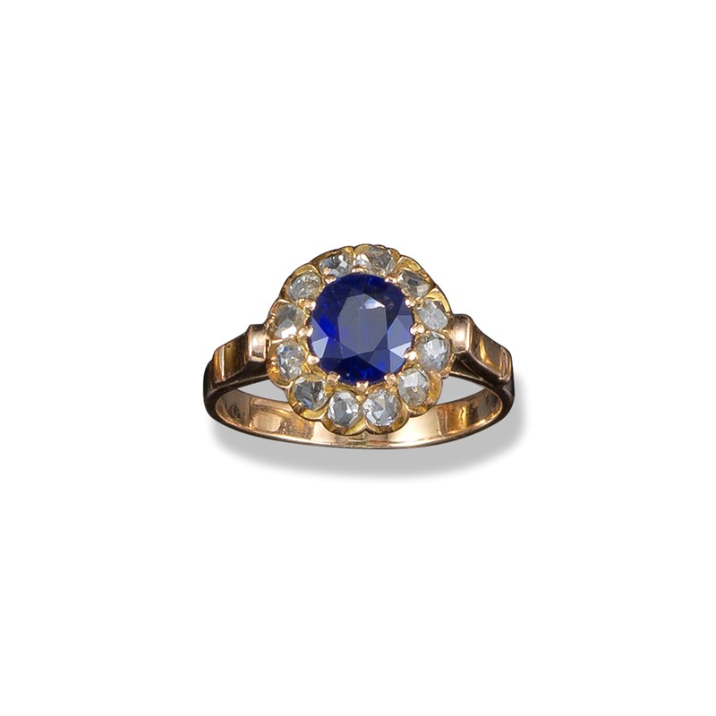 A sapphire and diamond cluster ring, the circular-shaped sapphire is set within a surround of rose-cut diamonds in gold, size L