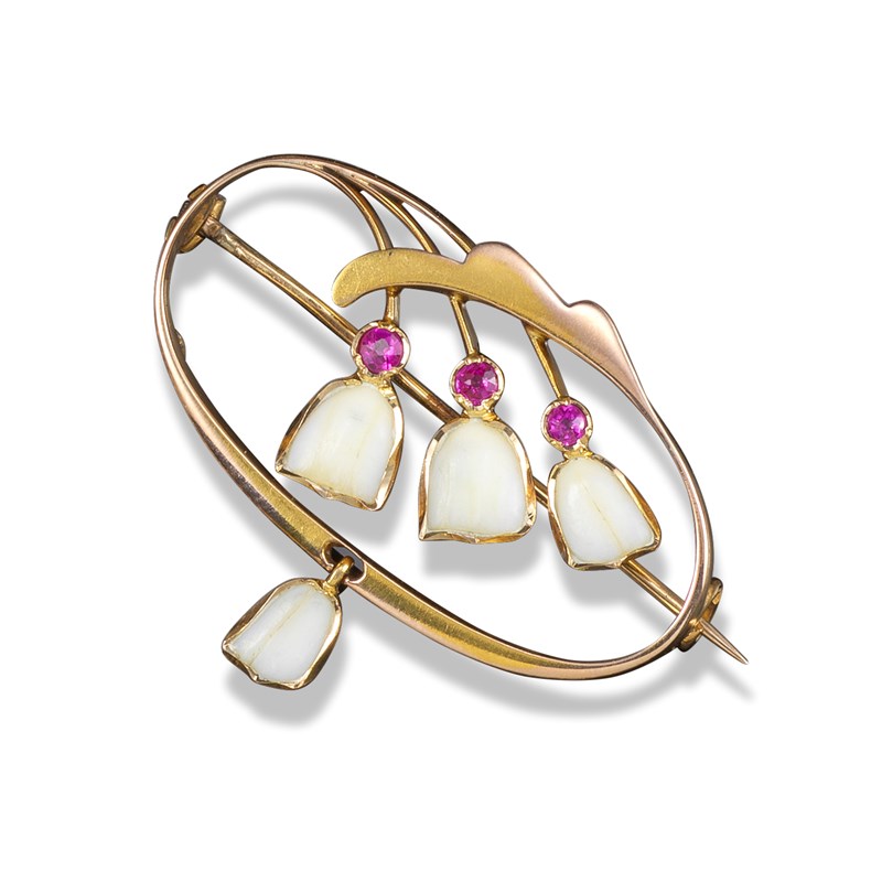 An unusual Art Nouveau gold floral brooch, incorporating children's teeth, each mounted with a circular-cut red stones and suspending a further tooth, 3.7cm wide