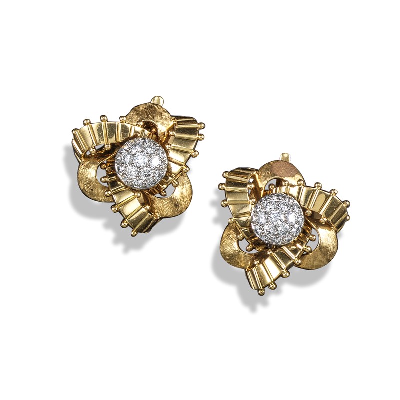 A pair of diamond earrings by Cartier, centred with a circular bombé panel pavé-set in platinum with diamonds within textured and fluted gold scroll surround, signed, clip fittings, 2.5cm diameter