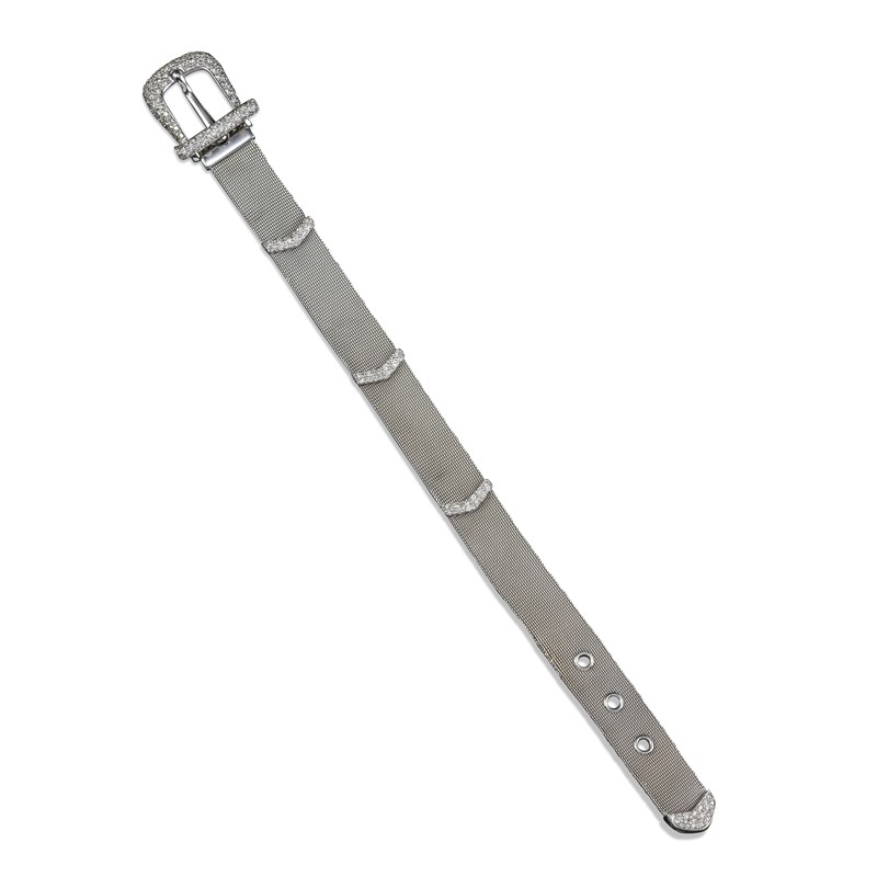 A diamond buckle bracelet, the woven white gold strap decorated with diamond chevrons and a diamond buckle, 22.5cm long