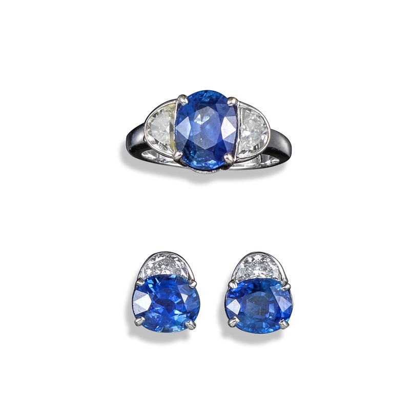 A sapphire and diamond three stone ring, the oval shaped sapphire is set with two half-moon-shaped shoulder diamonds, set in white gold and platinum, size K, with a matching pair of oval-shaped sapphire and half-moon-shaped diamond earrings set in platinum, each 1cm high