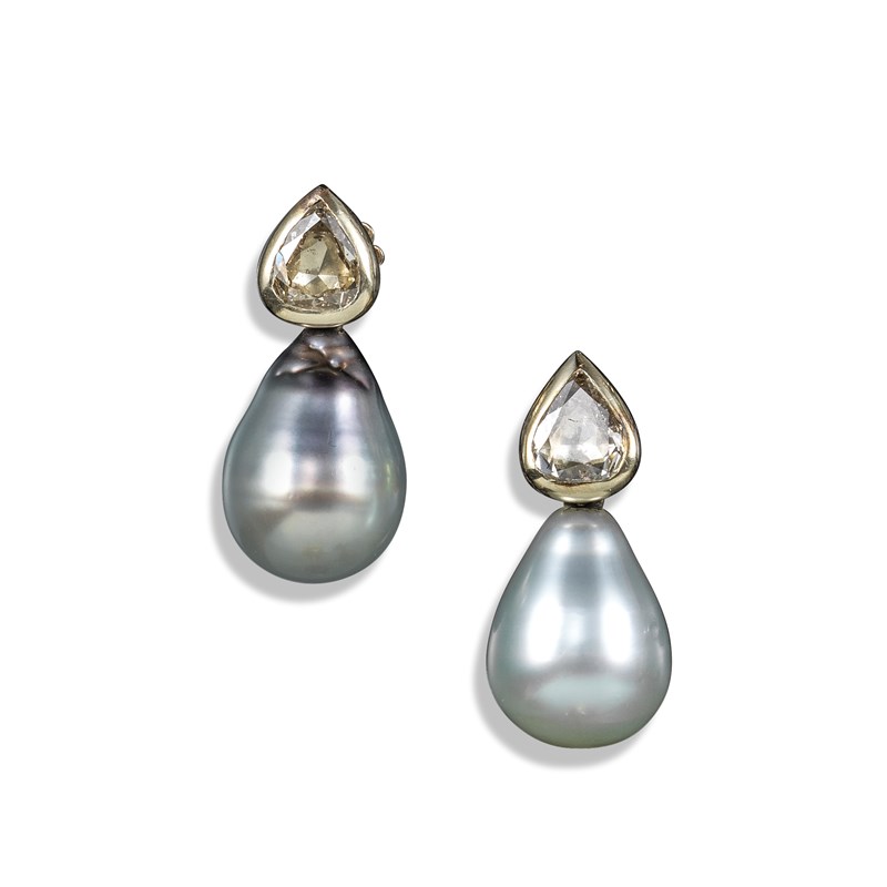 A pair of cultured pearl and diamond drop earrings, the upper sections rubover-set with pear-shaped diamonds in gold and suspending a grey and white drop-shaped pearl, 3cm high