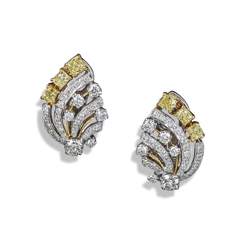 A pair of yellow and white diamond-set scroll earrings