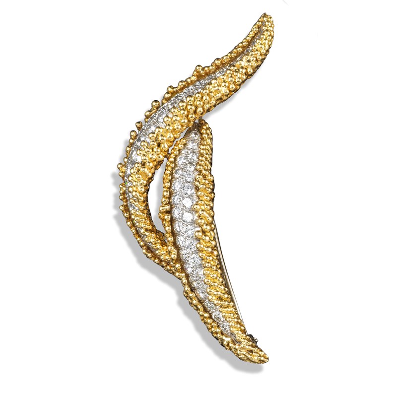 A gold and diamond abstract brooch, designed as two undulating lozenges of graduated circular-cut diamonds within a border of gold pellet decoration in platinum and yellow gold, 7cm long