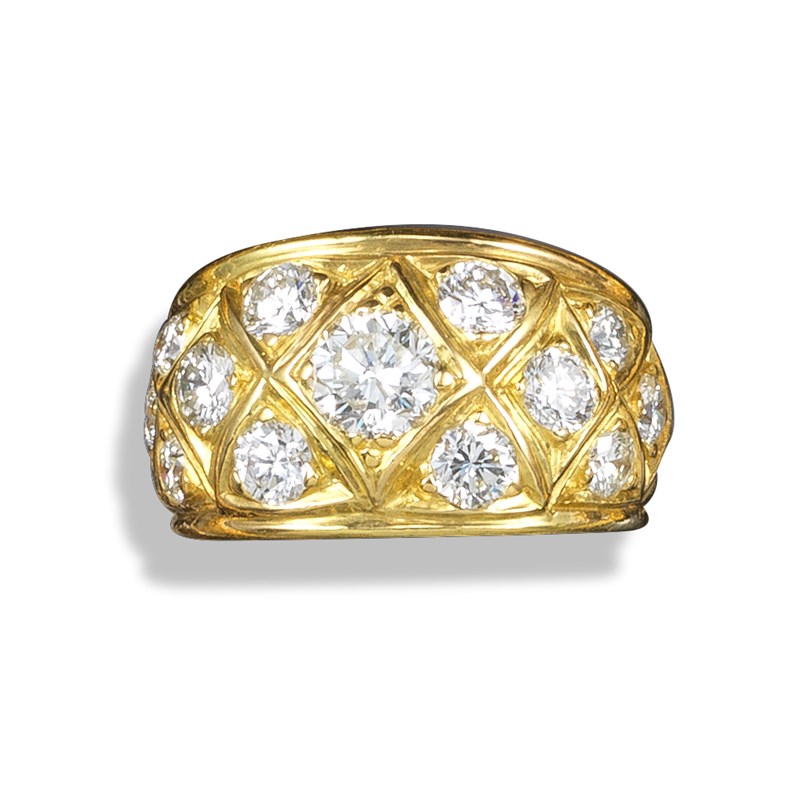 A diamond half hoop ring by Boucheron, of chequerboard design, set with graduated circular-cut diamonds in yellow gold, signed Boucheron Paris, rubbed maker's lozenge, inner re-sizing balls, approximately size L 1/2