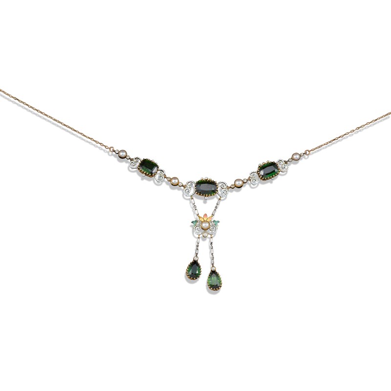 An Edwardian tourmaline and enamel necklace, the cushion-shaped green tourmalines set within scrolling enamel decoration and pearl and diamond links, suspending a scrolling link decorated with iridescent shaded enamel and a pearl and diamond, suspending two pear-shaped green tourmalines in platinum and gold, 40cm long, fitted case