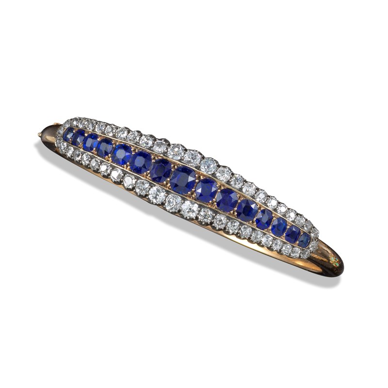 A late Victorian sapphire and diamond bangle, set with a central line of graduated cushion-shaped sapphires within border of old cushion-shaped diamonds in silver and gold, 5.8cm inner diameter, case