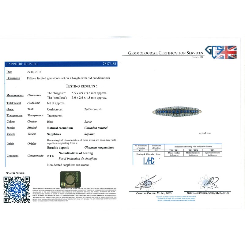Accompanied by report number 78173-82 dated 29 August 2018 from GCS, London stating that the fifteen cushion-cut sapphires weigh approximately 6.00cts and are natural sapphires with no indications of heat treatment. Origin: Basaltic
