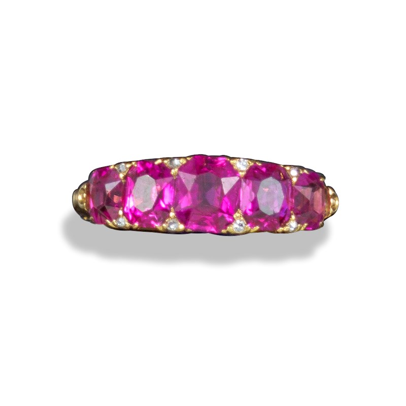 A late Victorian five-stone ruby ring, the half-hoop ring set with five graduated cushion-shaped rubies each separated with a pair of circular-cut diamonds in yellow gold, size N ½