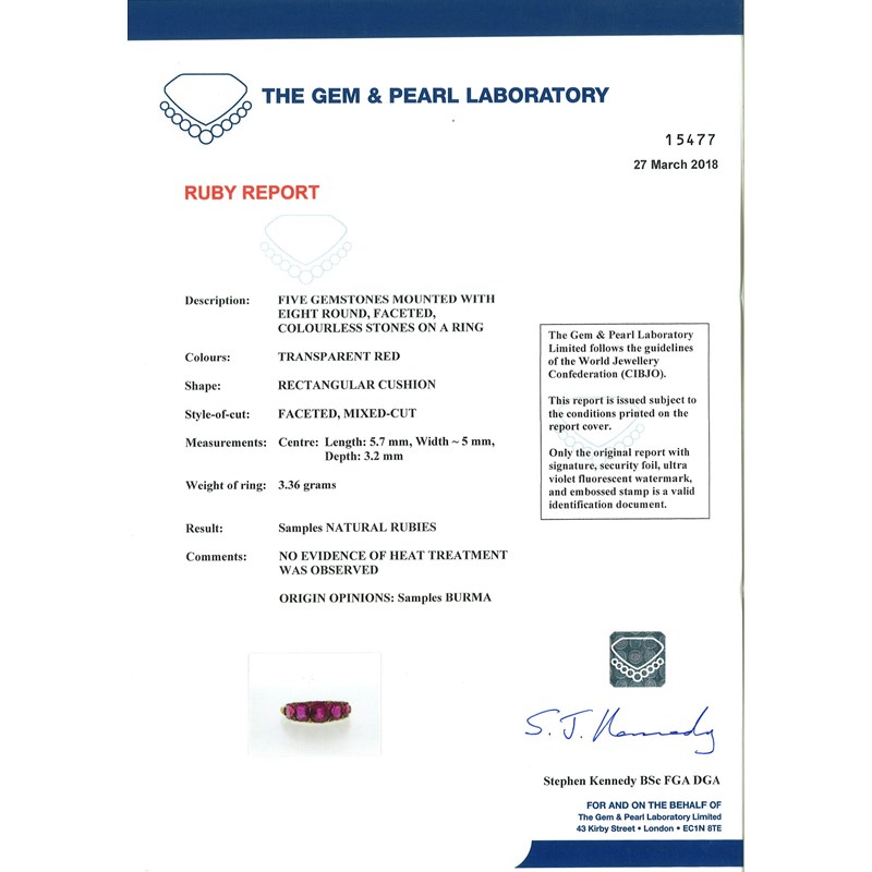 Accompanied by report number 15477 dated 27 March 2018 from The Gem & Pearl Laboratory stating that the five rectangular cushion-shaped rubies are natural rubies with no evidence of heat treatmemt. Origin: Burma