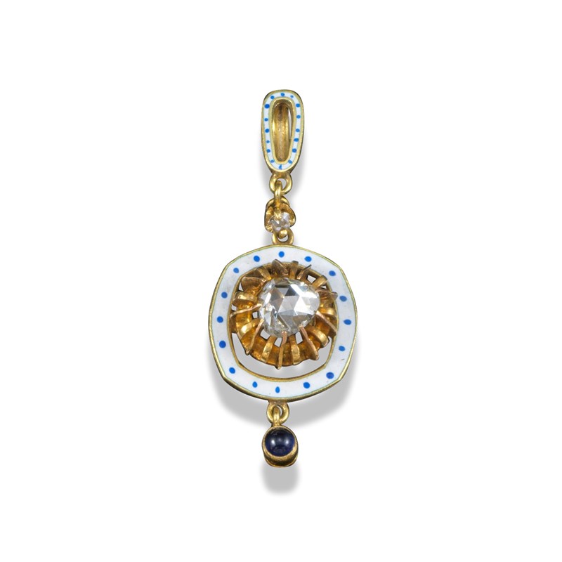 A diamond and enamel pendant by Giuliano, the rose-cut diamond claw-set in yellow gold within blue and white enamel border, suspending cabochon sapphire and suspending from a diamond with blue and white enamel pendant loop, maker's plaque C&AG to reverse, 3.6cm long
