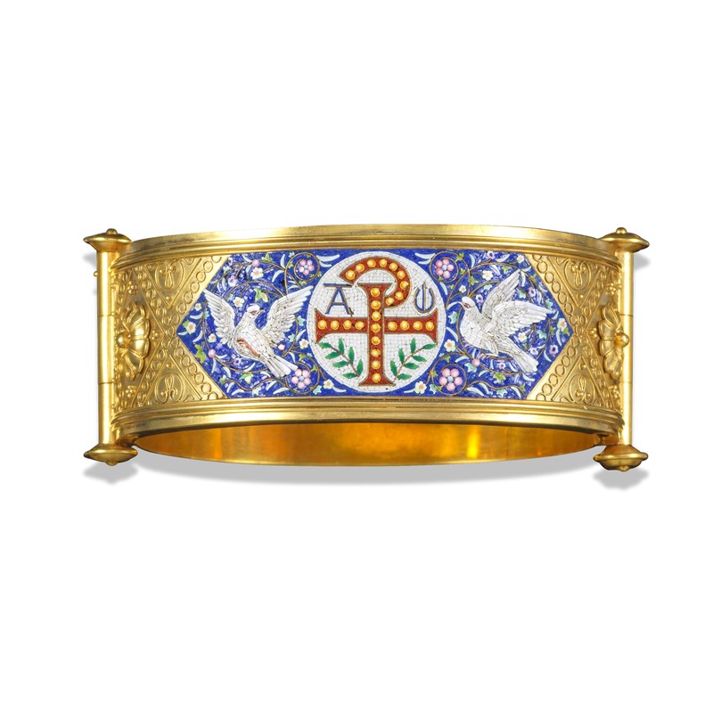 A 19th century gold hinged bangle with micro mosaic centre panel, the centre circular micromosaic section decorated with the early Christian Chi-Rho monogram between doves on a foliate decorated blue ground, fine gold revivalist pellet and wire decoration overall, 6cm internal diameter