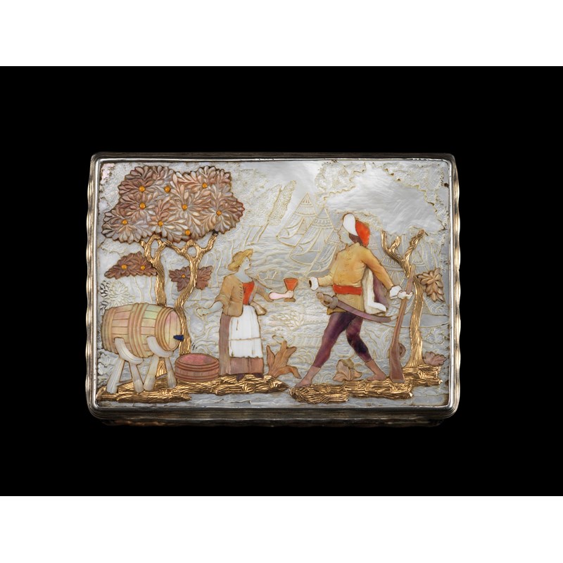 A Louis XV gold, hardstone, shell and silver gilt-mounted snuff box, by Antoine Daroux, Paris 1747, the rectangular box with hinged cover decorated with girl offering a drink from a nearby barrel to a soldier with gun and sword, gold highlights to the ground and tree trunks and all on a carved shell ground, depicting tents, with conforming scenes and decoration to the four sides and base, 8cm wide, the cover and internal base with the mark of Antoine Daroux, the silver borders with wavy decoration