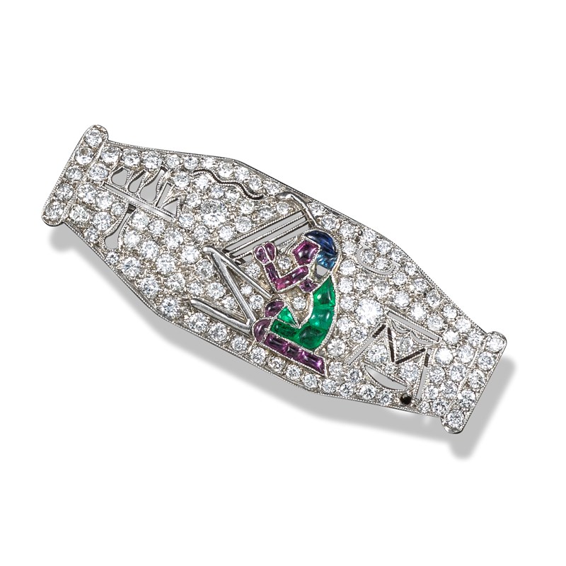 A French gem-set Egyptian Revival platinum brooch, millegrain-set overall with circular-cut diamonds and depicting a seated female figure set with emeralds, rubies and sapphires, the figure playing a ladle-shaped harp on a pedestal and to the left, a pierced table with flasks and loaves, to the right, a pierced amalgam of motifs and possibly a hyroglyph, the two motifs above and either side of the musician read as T & M, possibly the initials of the recipient, (one diamond and one coloured-stone missing), French platinum control marks, Austrian import mark, 4.5cm wide