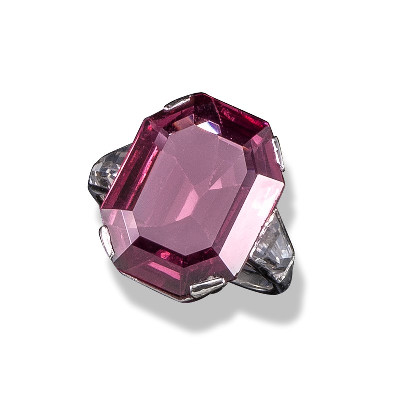 A pink spinel ring, the emerald-cut pink spinel weighs 10.10cts (known weight) and flanked with tapered baguette white stone shoulders in iridium and platinum, size L, case