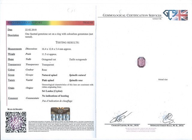 Accompanied by report number 78141-63 dated 22 February 2018 from GCS, London stating that the octagonal-cut pink spinel is a natural pink spinel with no indications of heating