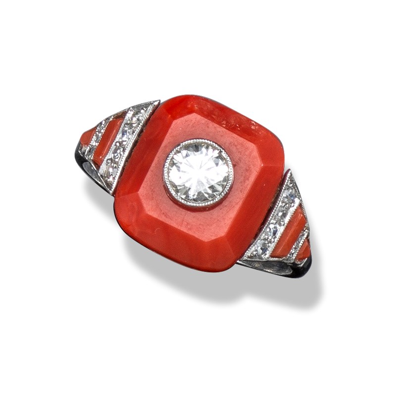 An Art Deco coral and diamond ring