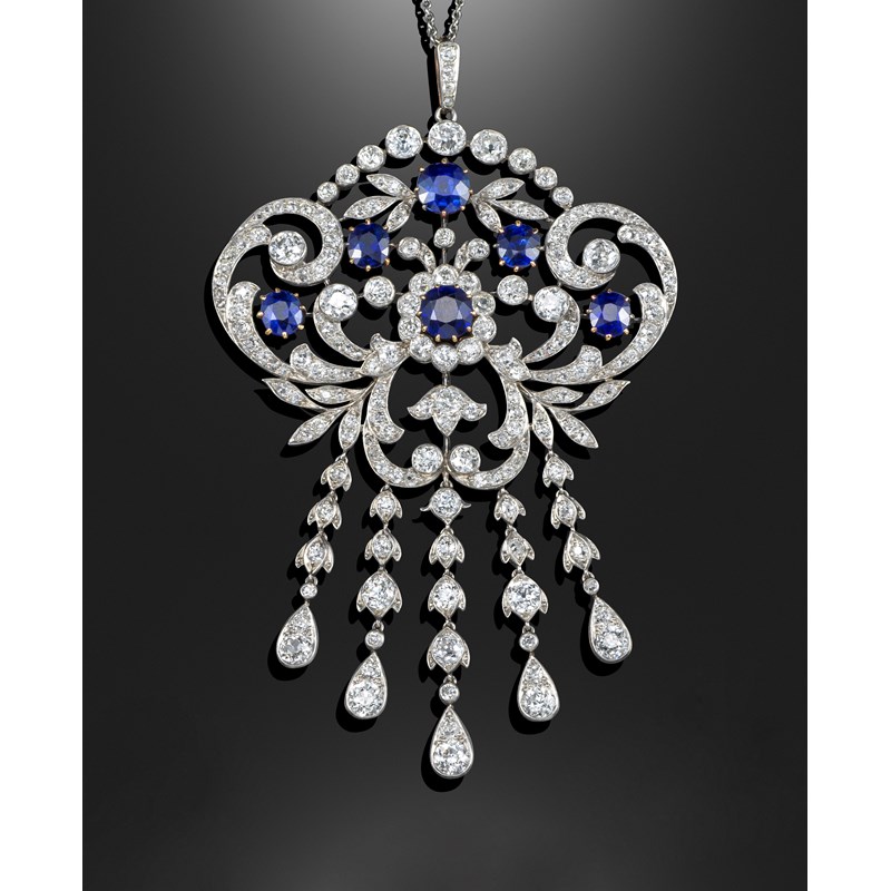 An Edwardian sapphire and diamond pendant, of foliate scroll form and set overall with graduated circular-cut diamonds and six slightly oval-shaped sapphires in platinum, on a fine-link white gold neckchain, with detachable brooch fitting and with screwdriver